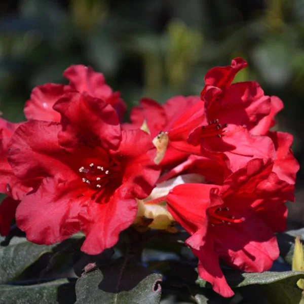The flowers are medium-sized, open funnels of fused petals, up to 2½ inches wide. They have an unusual waxy appearance, and are a wonderful scarlet red in color. They are carried in loose heads of up to 6 blossoms, at the end of each branch. Flowering takes place in the middle of the rhododendron season, which in most areas is early to mid-June.