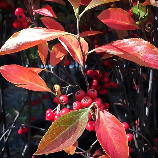 The leaves are smooth and glossy. They are oval, about 3½ inches long, with a dark green upper surface and a hairy, lighter gray-green lower surface. In fall the leaves turn brilliant shades of red. If you are familiar with the Burning Bush (Euonymus alatus), then you can picture how bright and colorful the Brilliant red Chokeberry is, because it is almost as bright as that famous tree. Because it is a native plant it will not escape into the wild and harm local ecology.