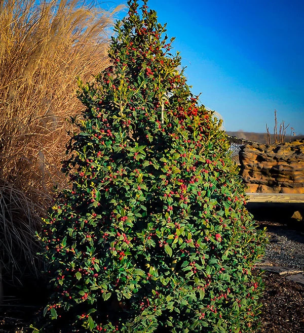 We all love to see those pyramids of green holly bushes, glistening dark-green in summer, and festooned with bright-red berries all through fall and winter. Probably we think it takes a lot of trimming to keep them looking so good – and that certainly used to be true. Not anymore. Newer varieties, like the Christmas Jewel® Holly, have been bred and selected to grow naturally into perfect pyramids without trimming, so now having those specimens in your garden has become super-easy. Imagine having such a beautiful bush, complete with rich-red berries in fall and winter, without all the work of trimming – what an opportunity.