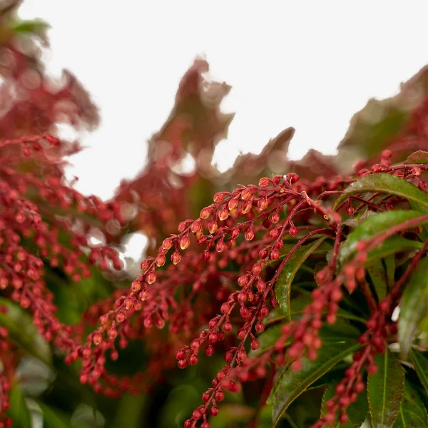 Spring in the garden is a wonderful season, when the buds that have waited, hidden, all winter burst into beautiful bloom, creating a magical time and making everything fresh and new again. There are also some special plants where the buds are almost as lovely as the flowers, and brighten not just spring but the winter months too. Outstanding among these are the Pieris shrubs, often called andromeda by older gardeners. For an outstanding example of just how lovely winter buds can be, long before they burst into bloom, it’s hard to look past the Dorothy Wyckoff Pieris. The mounded evergreen shrub carries pendulous bunches of deep red buds all through winter, looking beautiful and filled with promise. When the warmth of spring touches them they fulfill that promise by opening into delicate white bells, like lily-of-the-valley, making a beautiful display and touching our hearts with their beauty. An attractive evergreen the rest of the year, this beautiful plant deserves a home in every suitable garden.