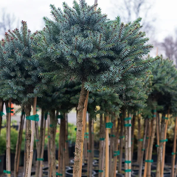 In every garden we need striking accents to catch the eye and hold our attention. In smaller gardens – or in beds in larger ones – this is often done best with a trimmed form – perhaps a cone or a ball. The problem is that these must be trimmed regularly to keep their value, and that can become a chore. That is why, when we found these beautiful Dwarf Serbian Spruce trees, we knew you would love them. They need no trimming, yet they form a perfect round ball, mounted on a sturdy, upright trunk. Hardy, reliable, with striking two-tone foliage, this really is the perfect choice for low-maintenance gardening that always stays neat.