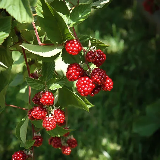 This raspberry can be grown as a free-standing bush, or on a system of supporting wires, depending on your needs. As a bush you can grow it among shrubs in a sunny border, beside a path, or right outside the kitchen door. For bigger crops and more serious fruit growing, plant several in a row, spacing them 2 feet apart, with two wires stretched between poles for support. Space the poles 10 feet apart, and the wires at 2 feet and 4 feet above the ground. Tie the canes loosely to the wires as they grow, spreading them out so they get lots of sun. You can also grow this plant against a sunny fence or wall, and even at the top of a retaining wall, tying the canes downwards in a cascading curtain – a really novel and fascinating way to grow it.