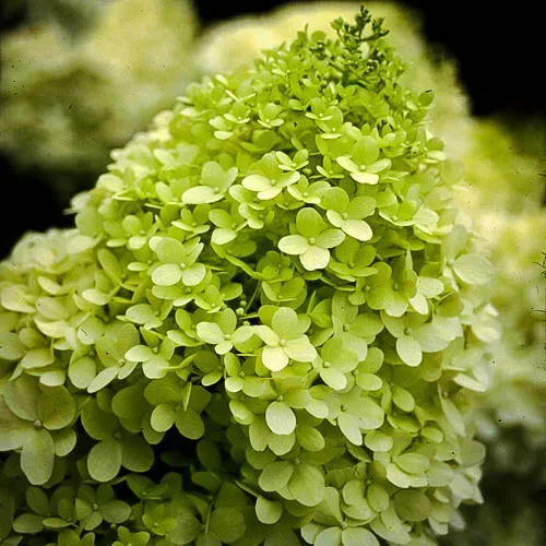 Hydrangeas have two kinds of flowers – small, fertile ones that make seeds but have no petals, and large, sterile ones that make petals but no seeds. These are mixed together in the flower heads and wild flowers mostly have the small fertile flowers, so they are not very showy. However, this new Japanese form had mostly sterile flowers, making large flower heads. This is the common PG hydrangea (Hydrangea paniculata ‘Grandiflora’) which is often seen in older gardens and parks. The flowers are plain white and the plant grows large. The Limelight Hydrangea is a much-improved form of this plant which was developed in Holland and introduced into North America in 2002.