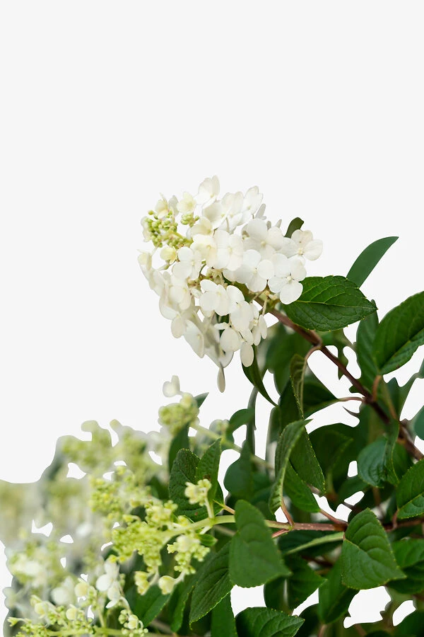 The Little Quick Fire Hydrangea forms a rounded shrub, between 3 and 5 feet tall. It has large oval green leaves that turn golden yellow in fall. The new shoots have hardly emerged in spring before you begin to see small green clusters at their ends. These quickly expand into cone-shaped fat flower heads of about 75 flowers. The flower heads are about 6 inches long – a perfect size for a smaller bush. The flowers begin greenish-white, but quickly turn pure-white, making a lovely showing in your garden, and standing out beautifully.