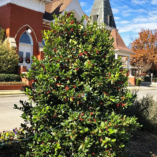 Around 1900 Mr. Nellie Stevens picked some berries from a holly tree growing in the National Arboretum, in Washington D.C. He grew some plants and one he planted in his garden was very hardy and attractive. It turned out to be a natural hybrid between the Chinese holly (Ilex cornuta), and the English holly, which was why it was so hardy and vigorous. The original tree grew in his garden in Maryland until his daughter made it available to growers around 1954. It soon became a very popular tree, particularly because it is the only holly tree that will produce berries all by itself.