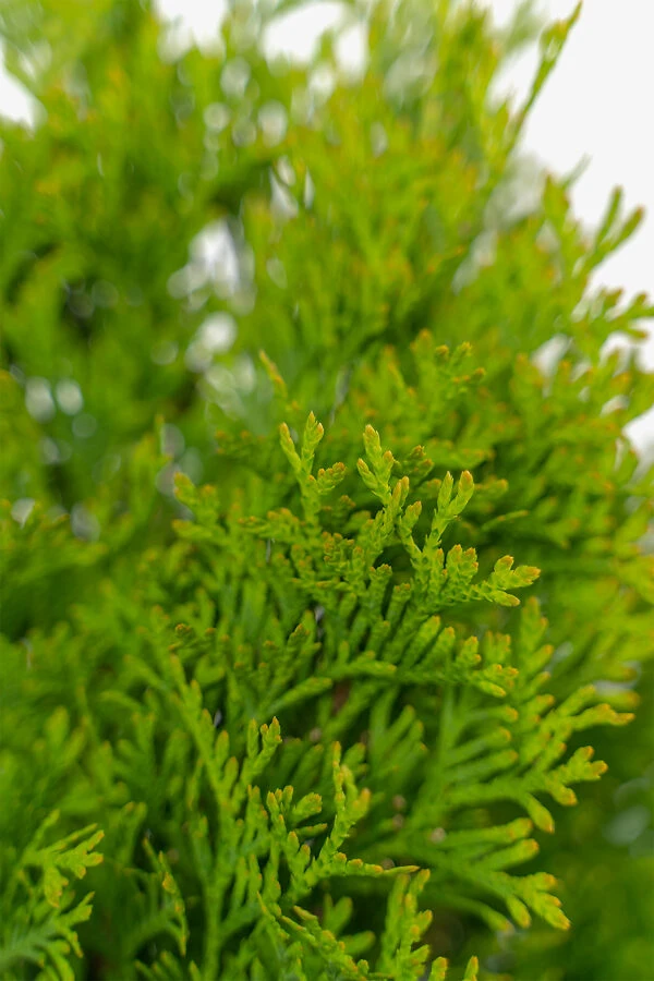 The foliage is carried densely all along the height of the tree, from top to bottom, clothing it completely is a rich, bright green color. The foliage consists of very small scale-like leaves that cling to the young branches. These grow in spreading, slightly curved but flattened fans, giving a shell-like and graceful form to the foliage. Each spray lasts for several years, keeping the bush lush and green all year round. In time, as new growth replaces them, these sprays drop neatly into the inside of the bush. The foliage color is a strong, rich green, and it stays that way 365 days of the year, with none of the winter bronzing or burning that other forms of this tree can have.
