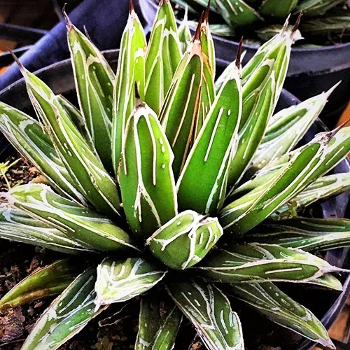 Porcupine Agave is a stemless perennial succulent plant, forming a round, dome-shaped cluster of fleshy leaves, arranged in concentric spirals. It sits directly on the ground, forming a neat flattened ball of many leaves that in 10 years will be about the size of a basketball. Each leaf is thick and like a broad triangle in cross-section, with an almost flat inward face and a back with two sides. The leaves taper gradually to an abrupt point, topped with a short black spine, but the edges of the leaves are smooth. There are white lines along the mid-green leaves forming a sophisticated and elegant pattern.