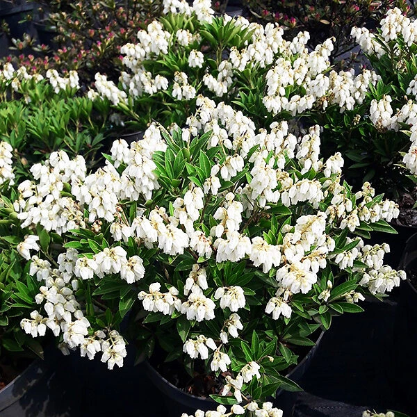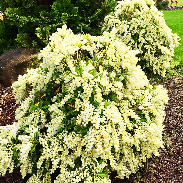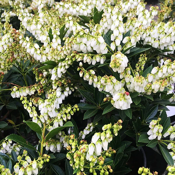 If you visit your bush in late fall you will see curious greenish ‘fingers’ clustering at the ends of the stems. These are the flowers for the following year, and they slowly expand through the winter months until they hang in pale-green clusters from all the branch ends. These clusters remain this way into spring, and this variety is later to bloom than many other Pieris, making it a valuable addition to extend the season of these lovely bushes. The flowers open in April and into May, on arching branches that are a little shorter and less pendulous than we see in most other Pieris. An abundance of flowers are produced, virtually hiding the leaves entirely – more than we have seen on other varieties. They are pure snow-white bells, packed tightly along the flower stems, and they do look a lot like the flowers of lily-of-the-valley, although these plants are not related. They have the sweet fragrance of honey, and last well, making a display that you are going to love.