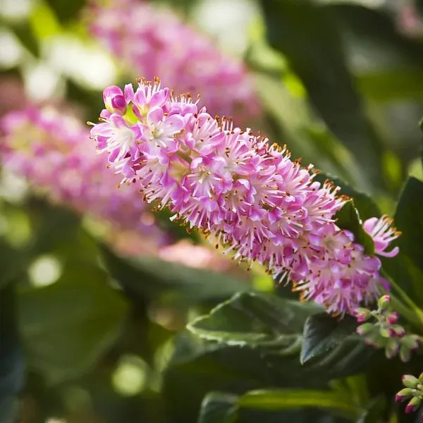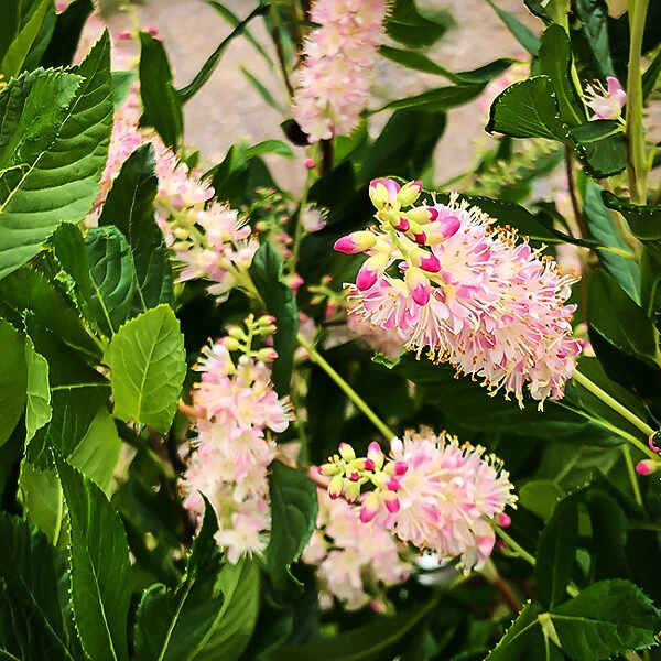 Flowering takes place on the end of new shoots, and by July or early August they begin to appear. A fat, upright cylinder of flowers, usually 3 inches long, but up to 6 inches long, sprouts from the end of the shoot, and it is packed with many, many tiny flowers, a little more than ¼ inch across. Perched on tiny stalks the blooms have 5 flat petals that are bright, rosy pink, with a fuzzy cluster of stamens protruding from the center. These delightful bottlebrushes release a powerful sweet perfume, which of course is the source of the plant’s common name. Rising above the leaves, the whole effect is bright and charming, especially with the insects and beautiful hummingbirds hovering around them. The flowers are followed by brown seed pods that look attractive all through winter. The flowers persist for a long time, and this shrub has one of the longest flowering periods of any, and still in bloom at the end of September.