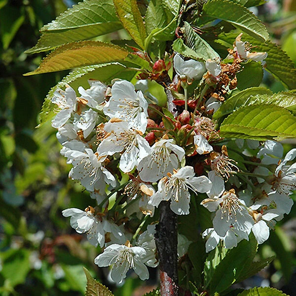 Flowers appear in early April, along with the first tiny leaves. They are typically in pairs, but can be in clusters of up to 6 blossoms. The flowers are about 1-inch across, and pure, snowy white, with yellow stamens in the center. A tree in bloom is charming to see. Like many sweet cherries, the Sam Cherry Tree needs to be grown with a different variety to act as a pollinizer – the pollen will be distributed by bees. Not many varieties are favorites, but we recommend the Stella cherry, which is also a ‘universal pollinizer’ for most cherry varieties. Plant within 50 feet of each other. Other possible pollinators you might already have include ‘Van’, ‘Bing’, and Napoleon’ (also known as Royal Ann).