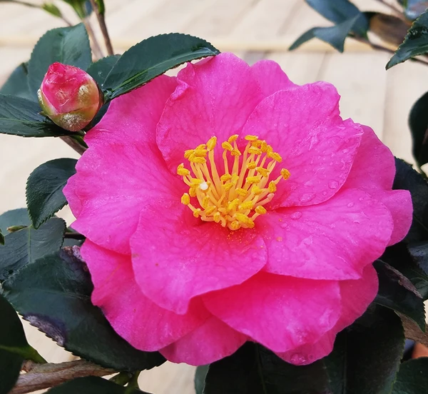 When it comes to garden must-haves, the ‘Shi Shi Gashira’ Camellia is a no-brainer. In terms of beauty, few other adaptable low-lying shrubs exist that can produce such stunning flowers. Large magenta blooms, nearly 3 to 5 inches in diameter, embellish the glossy green serrated leaves of the Camellia, which eventually reaches about 5 feet in height. Each dark pink flower is accented with bright goldenrod-colored stamens centered in each bloom. The petals appear to double in number, adding texture and variety to the display.
