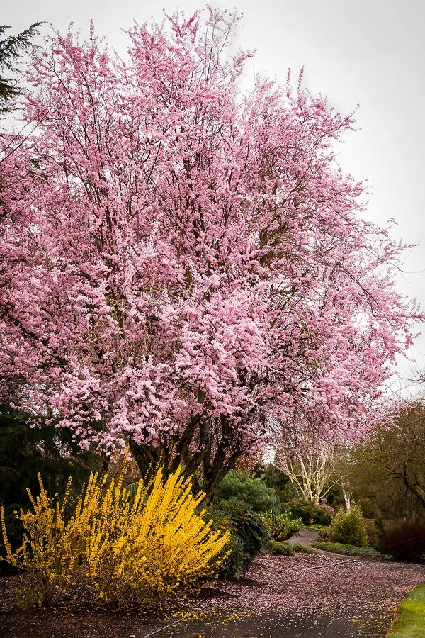 The flowers are followed by a crop of 1-inch edible plums, also colored purple-red. These are not like the large edible plums, but they can be used to make delicious jams and chutneys. Don’t plant this tree over a paved surface, as the falling plums can stain stonework and brick, as well as being a slipping hazard. On a lawn or in a garden bed they will quickly be removed by squirrels and birds, who love them. Some years you may see very few fruits, depending on weather conditions during flowering.