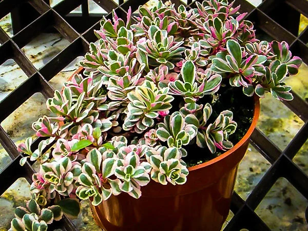 Because of its spreading habit, and a tendency to develop roots on stems as they trail across the ground, Tricolor Sedum is the perfect plant for ground-cover in hot, dry areas with limited soil. Although it roots and spreads, it is never invasive, and can easily be removed if it should chance to go where it isn’t wanted. As well, if you have hard surfaces you want to hide, or old pavers and slabs you want to soften and make more beautiful, Tricolor Sedum can be planted in the spaces between stones, and it will spread and obscure them.