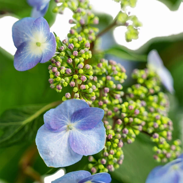 The Twist-n-Shout Hydrangea thrives in partial shade, so it is ideal for those more shady parts of your garden, in beds on the north side of your house, under trees and in wooded areas. Use it at the back of smaller beds, or in the middle of larger ones, or plant it as an informal edge along a fence, a path, or a driveway. Use it as part of the foundation planting around your home. With its weather-resistant flowers it will always look great without staking or a lot of care. It grows easily in most types of soil, if they are well-drained and not too dry. A steady supply of water for your plant is the secret of keeping it blooming continuously. Mature plants are not very drought resistant, so water regularly, especially during summer and dry periods. Regular fertilizer will help those blooms keep on coming and coming. If you grow this plant in a pot you can control the color by using suitable fertilizers and soil for acid-loving plants to create blue hydrangeas. No pruning is needed – just remove dead stems in spring once new leaves are seen. In colder zones most blooming will be seen on new shoots that develop from the base, if older stems are killed in winter.